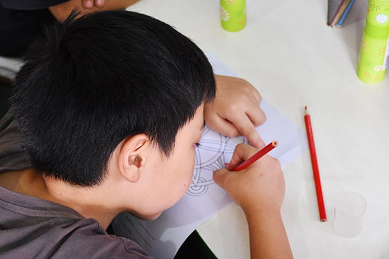 所謂磨刀不誤砍柴工,要想路上跑得快就得先吃飽。王老師先用“大西瓜,小西瓜”的游戲先讓小朋友們解一解暑氣,讓孩子們集中精神更好的投入到活動中;修整完畢后,王老師帶領孩子們來到“神秘古堡”前,如何才能進入城堡內(nèi)呢?王老師說需要大家一同來推測城堡的密碼。在猜數(shù)字的游戲中,王老師充分調(diào)動這個小團體自身的力量,引導他們仔細傾聽、認真思考,最終在孩子們的共同努力下終于猜得密碼,進入古堡;進入“神秘古堡”內(nèi),大家發(fā)現(xiàn)周圍漆黑一片,沒走一步都是一次驚心動魄的冒險,真可謂是步步驚心,王老師拿出神秘道具,讓孩子們利用道具一步步登高,最終到達古堡頂部;在“神秘古堡”中生長一種神秘的花——曼陀羅,只有成功登頂?shù)挠抡卟拍芸吹剑宜總€人的眼睛里呈現(xiàn)的樣子都不一樣。王老師給每個孩子分發(fā)一盒彩筆,讓成功登頂?shù)倪@群勇者們在紙上自由呈現(xiàn)心中的曼陀羅模樣。